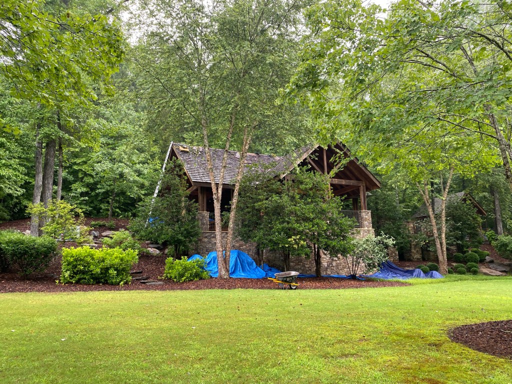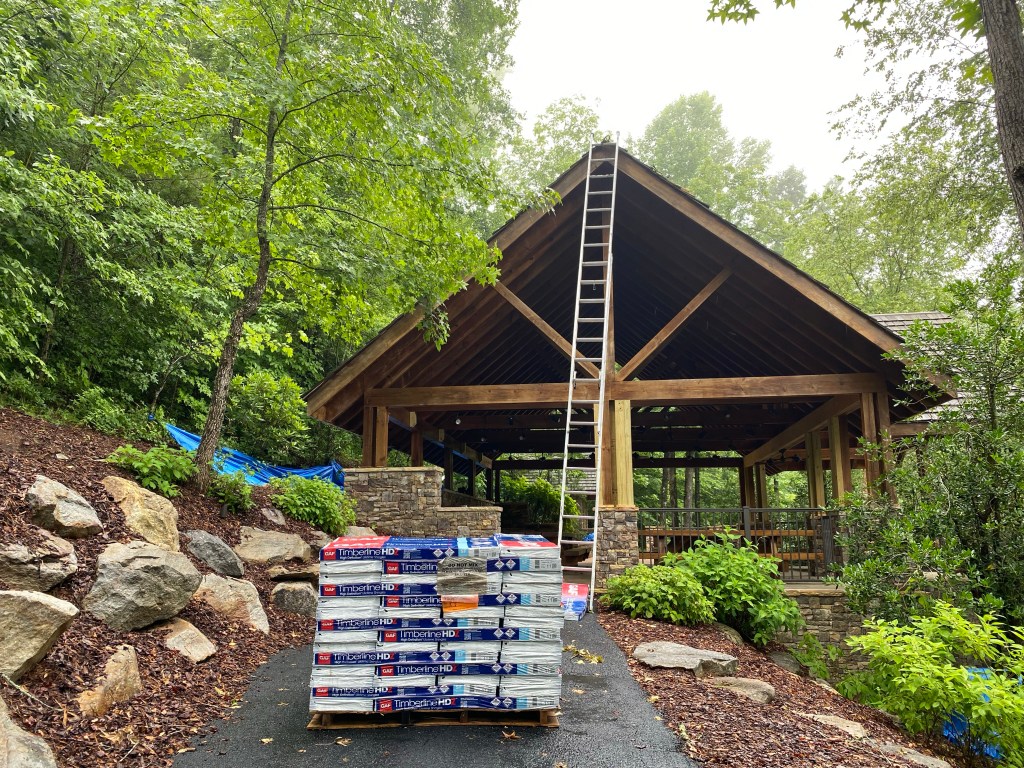 The cedar shake roof on our pavilion is being replaced this week with architectural grade shingles. (Replacing the cedar shakes was cost prohibitive.) The contractor started today and should be done this week. The haul off of the existing cedar shakes will be a particularly big task for them.